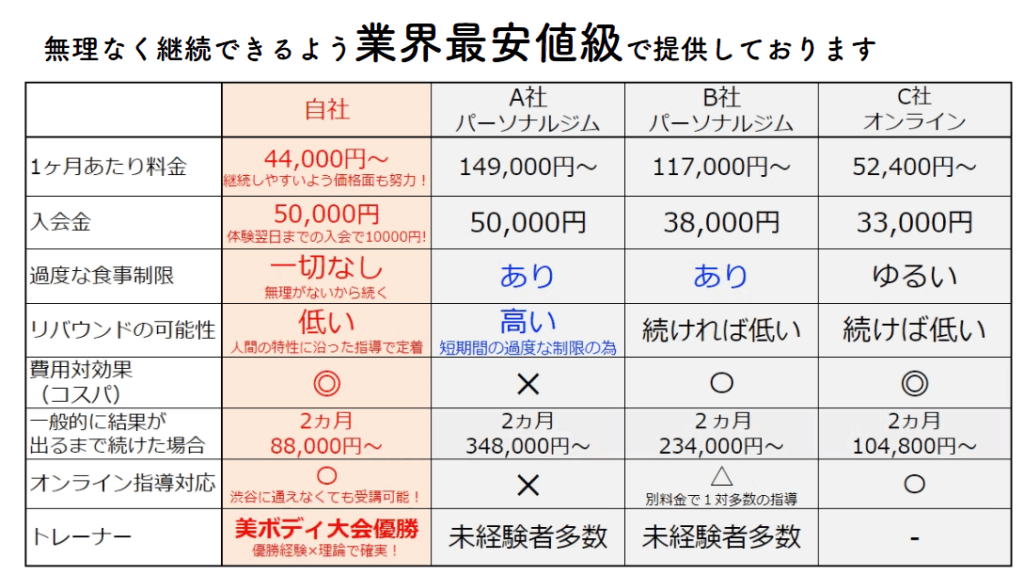 そのため、大手ジムよりお安く提供でき、なおかつ格安ジムや自己流よりも、結果を出しやすいのですね。