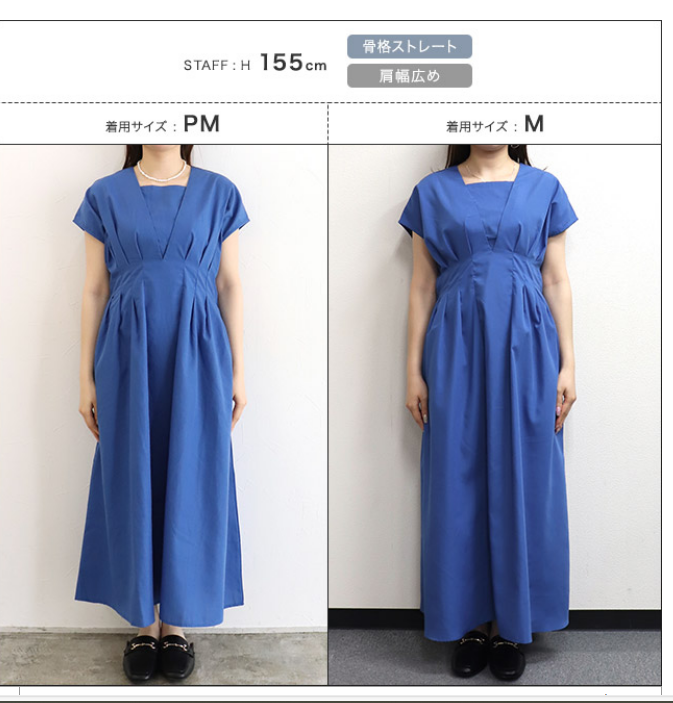 そして、さらに嬉しいのが、実際に背の低いモデルさんや標準、背の高いモデルさんを使って、PサイズとM、Lサイズの着用時のイメージ、を表してくれています。