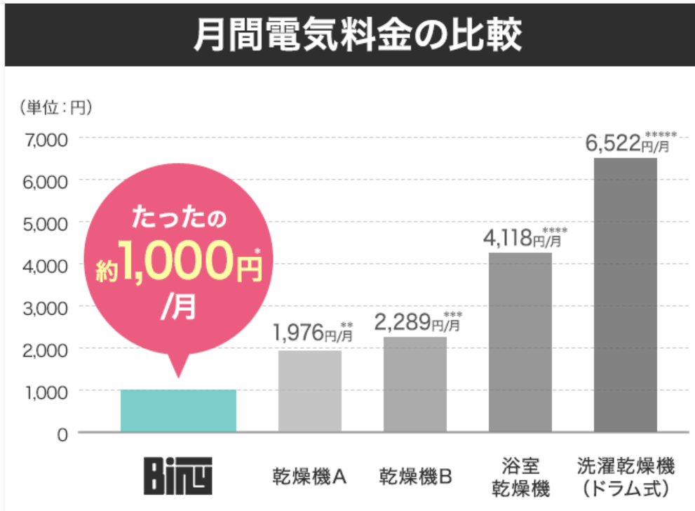 ビニーとその他の乾燥機の電気代料金の比較が下になります。